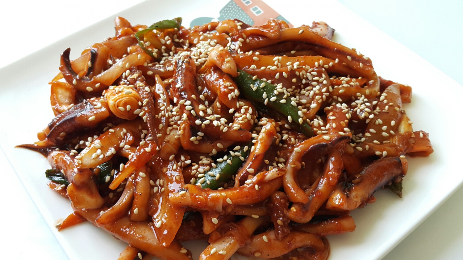Frischer Tintenfisch mit verschiedenem Gemüse, gebraten in würzig-scharfer koreanischer Sauce. Leicht, proteinreich und voller Aroma.
